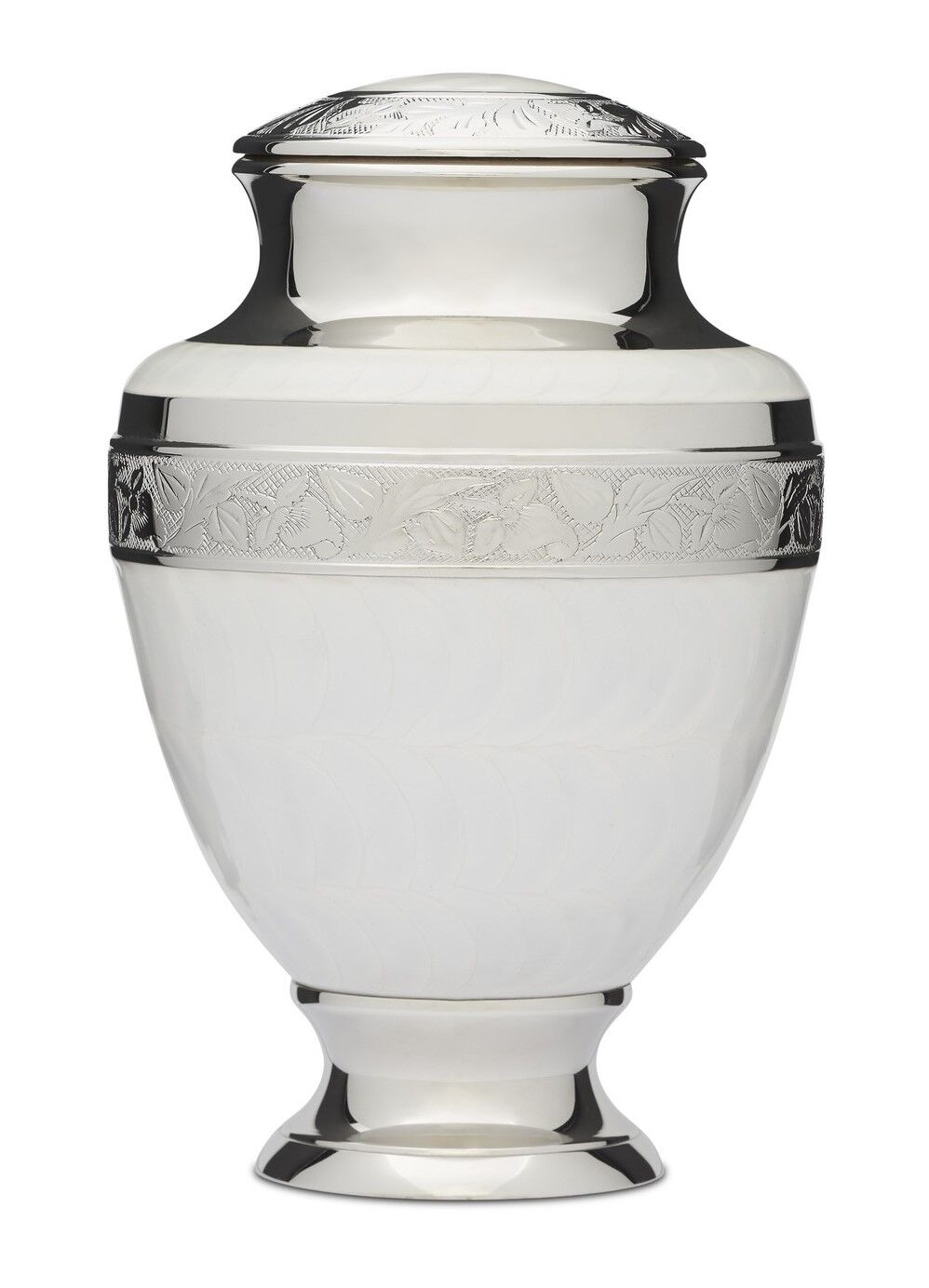 This beautiful white enamel urn has a delicate leaf pattern embedded in the silver nickel plating. The white enamel has a natural soft hammer pattern running in circles around the body of the urn. This cremation urn is made from solid brass, requires no maintenance, is very well made, and is heavy in weight.