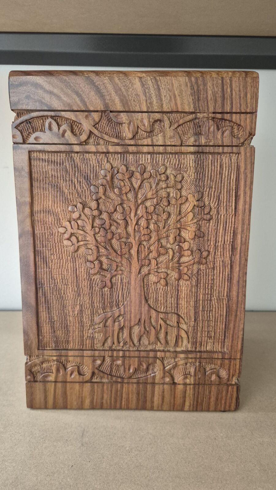 This Tree of Life Wooden Urn has been beautifully crafted with an intricate hand-tooled design. Made from solid Sheesham wood (an Indian Rosewood) and finished with a clear coat lacquer. This urn fits a standard plastic ash box from the crematorium, so you do not need to transfer ashes.